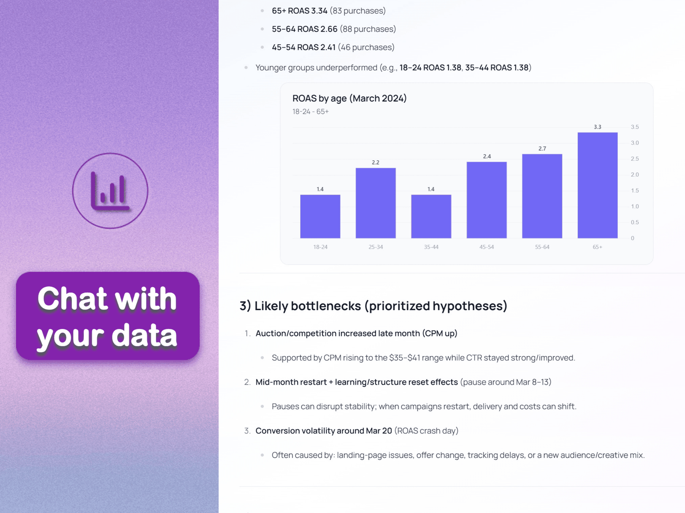 Ask questions in plain English. Get instant answers backed by your actual ad data. No spreadsheets. No guesswork.